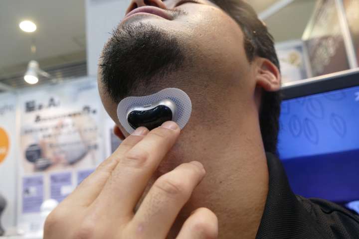 低周波EMSを発していびきを解消するデバイスは、なんと喉にペタッと貼り付ける仕様。