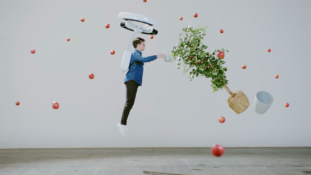 「Lunavity」は、バックパックのように背負って装着するデザインで、本体上部に円周上に配置された16個のローターにより装着者の動作に合わせて浮遊力を発生させる仕組みです