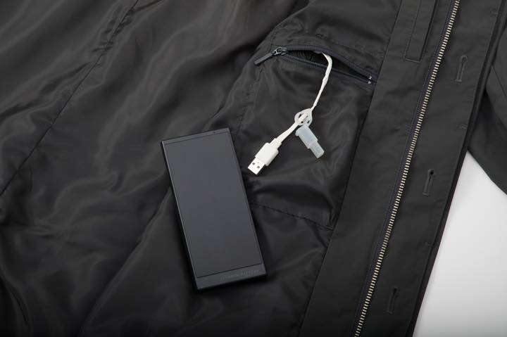 コートの内側にはUSBコネクタを搭載したバッテリーポケットがあり、